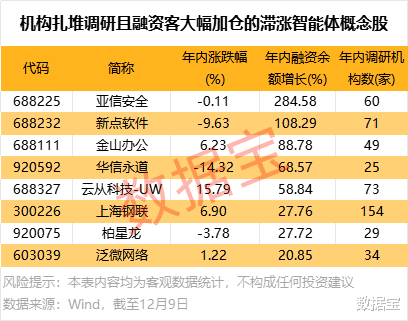 最新融资余额较去年末增超20%且年内股价涨幅低于25%(跑输智能体概念指数年内整体涨幅),年内获得20家以上机构调研的概念股仅有8只。其中,上海钢联、云从科技-UW、新点软件年内机构调研家数居前。
