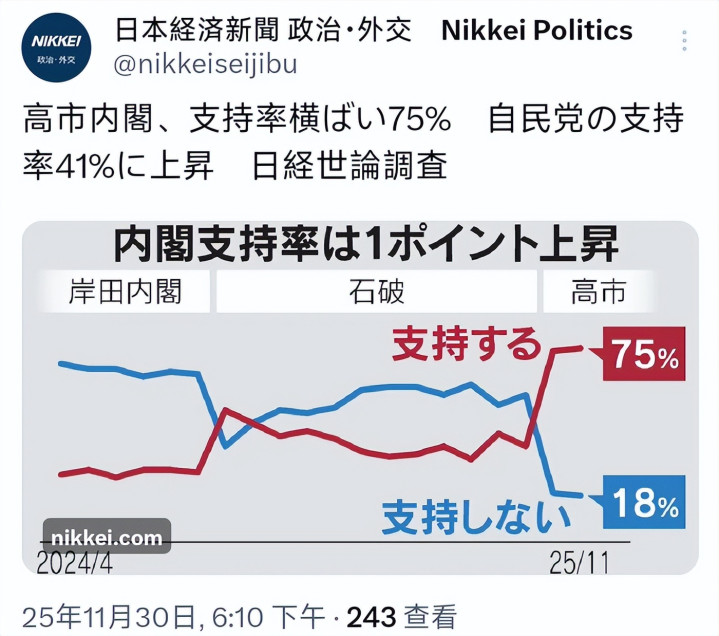 中国随即展开反制,但出人意料的是,高市的支持率不仅没有下滑,反而逆势上涨至75%,自民党的支持率也从36%升至41%。